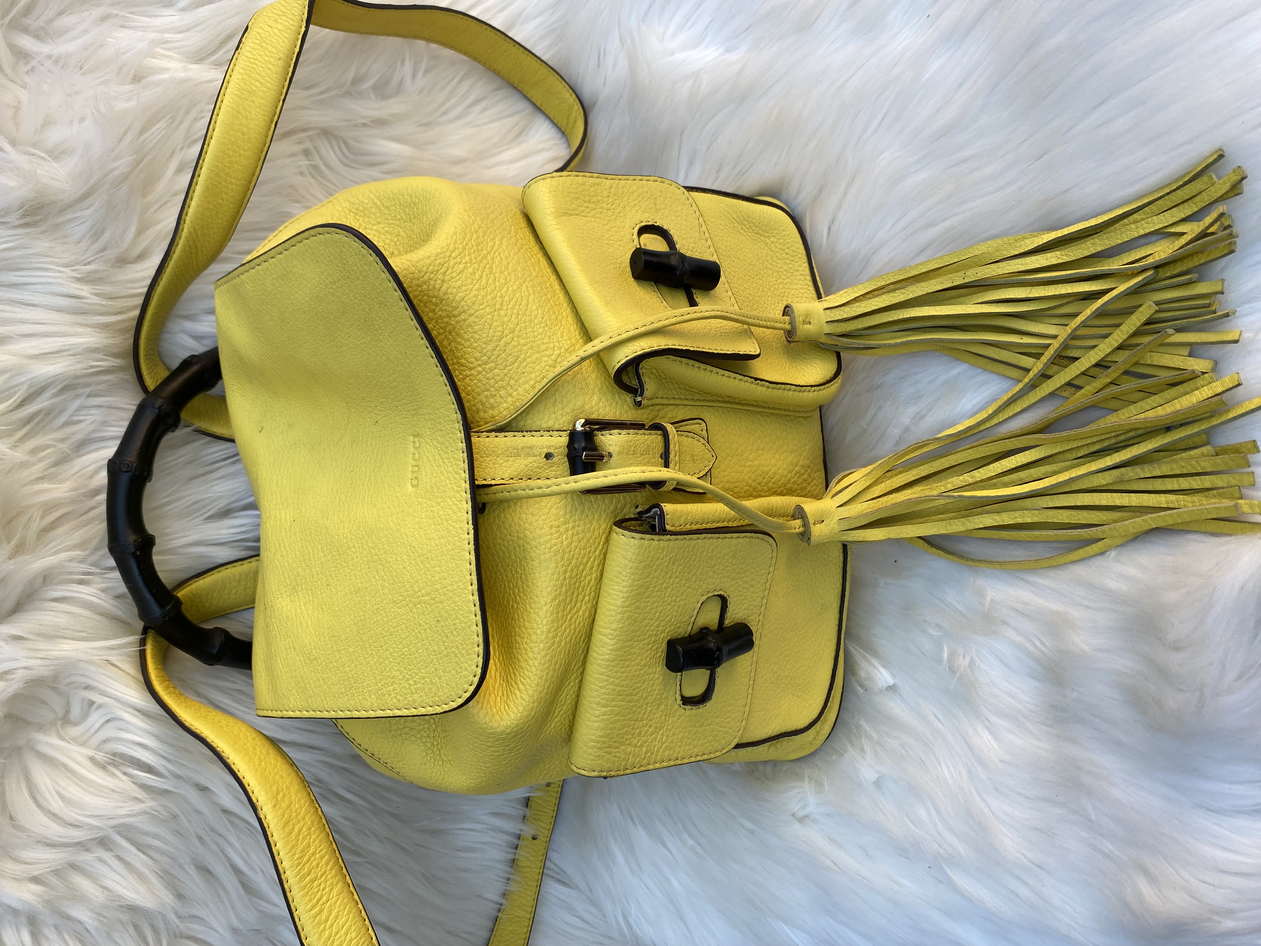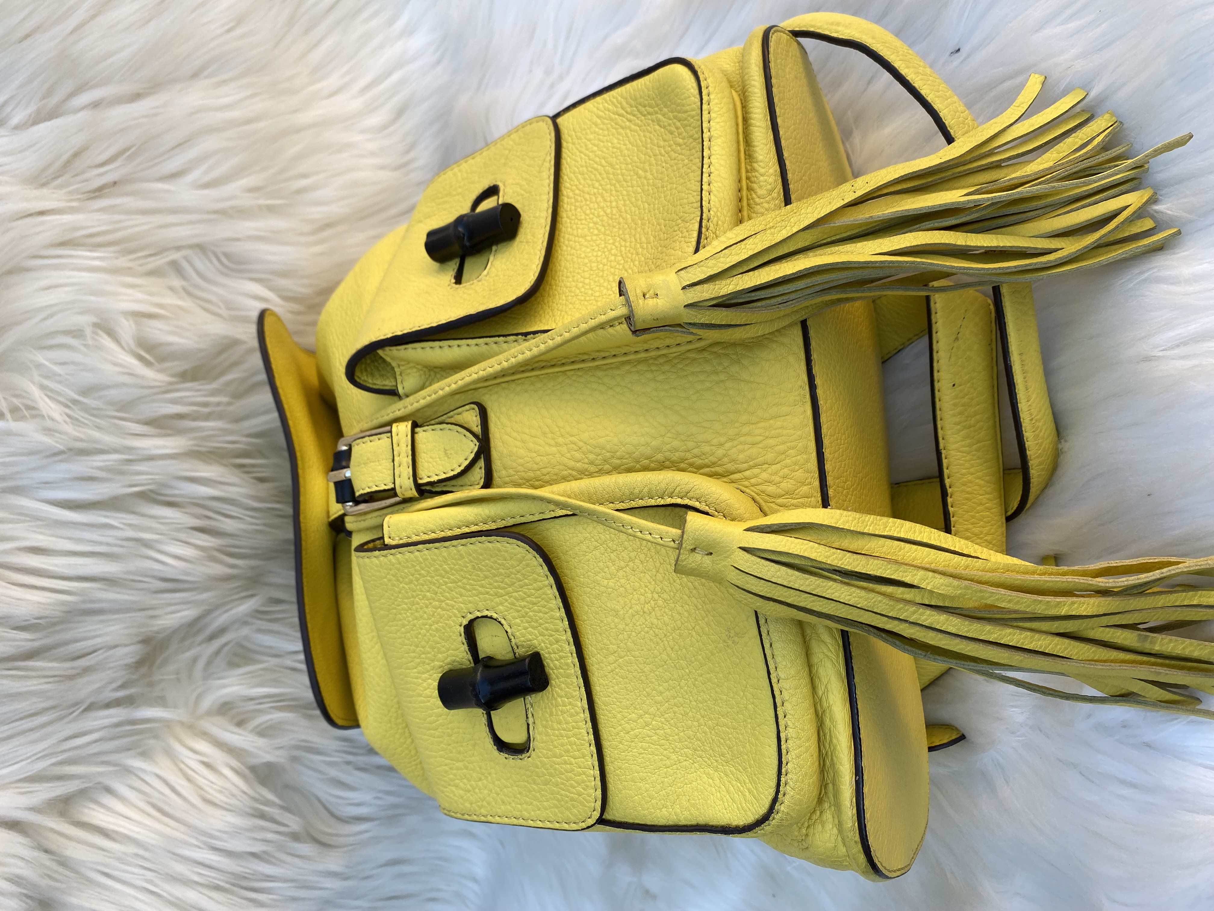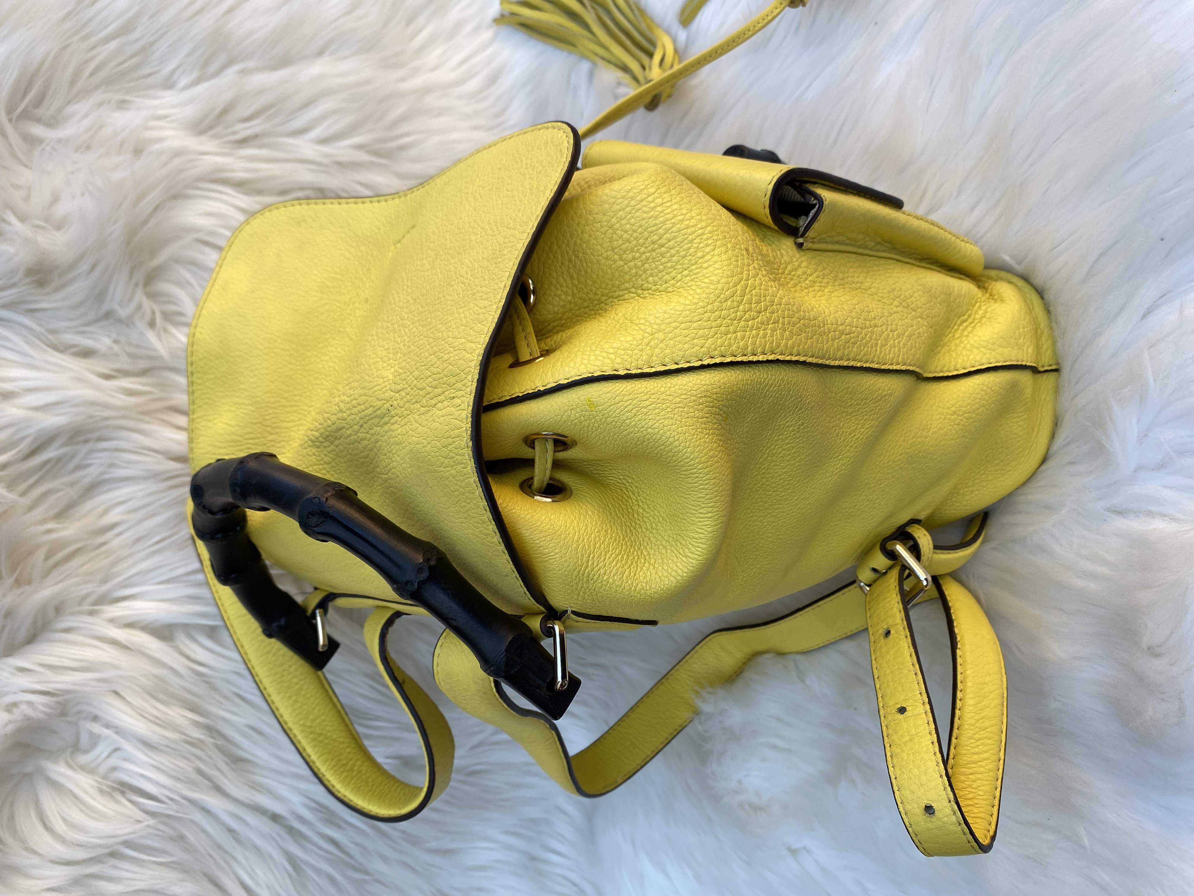 Gucci leather backpack in yellow colour with bamboo handle. Medium size. Good condition.