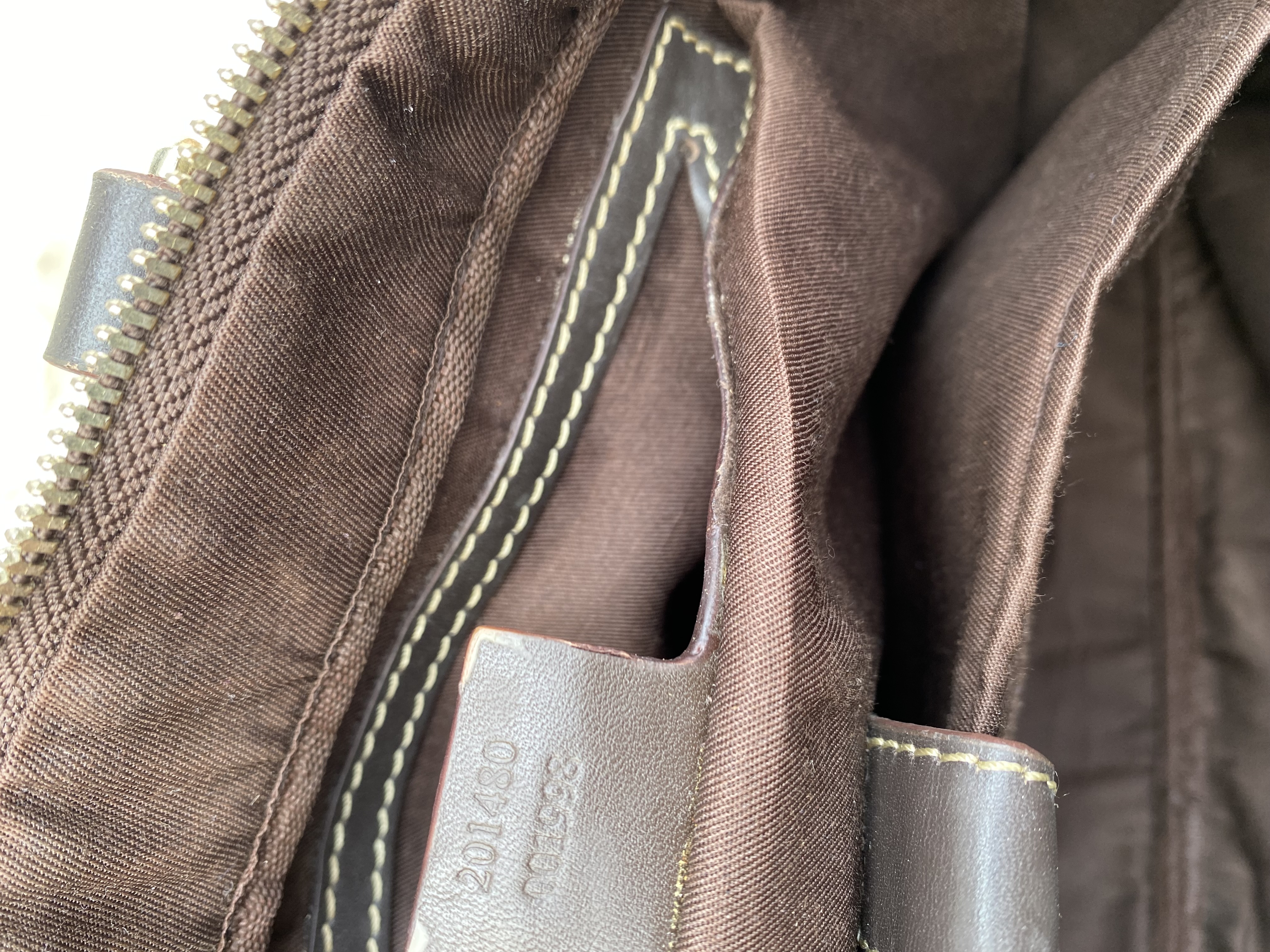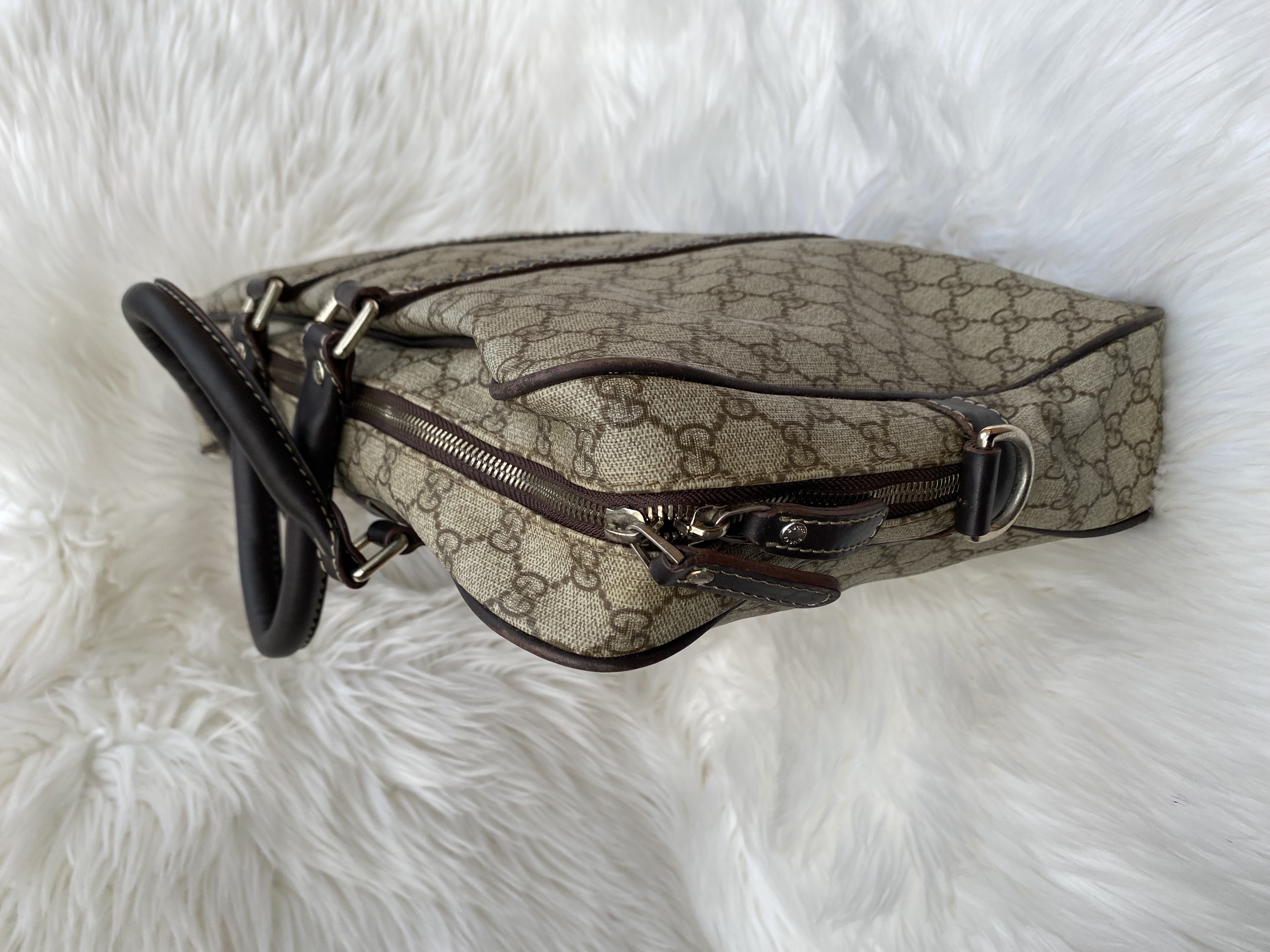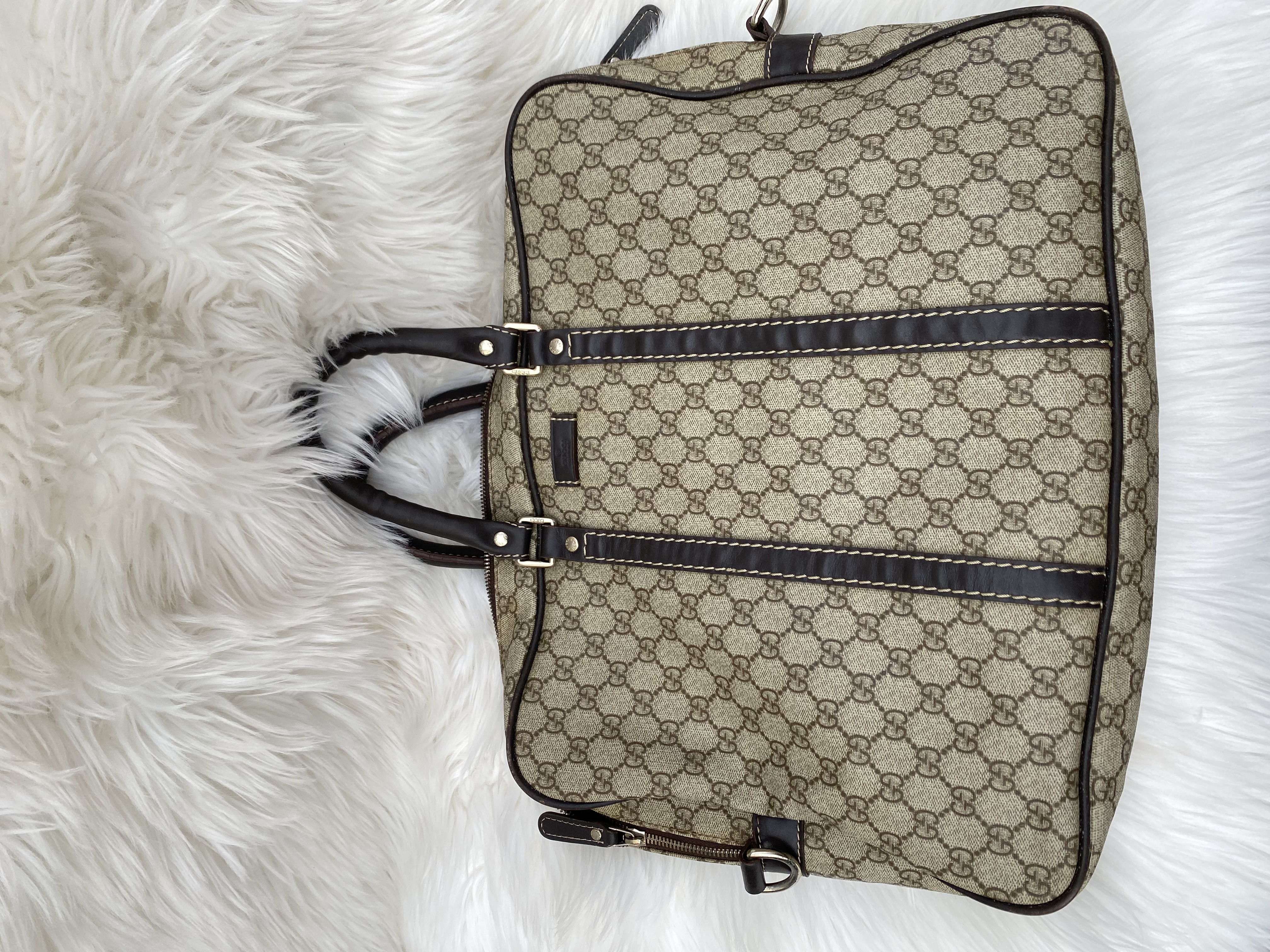 Preloved Vintage Gucci GG on canvas briefcase.model number: 201480. Genuine natural leather handles and trims. Suitable for laptop and files.L40cm..H30cm..W8cm.