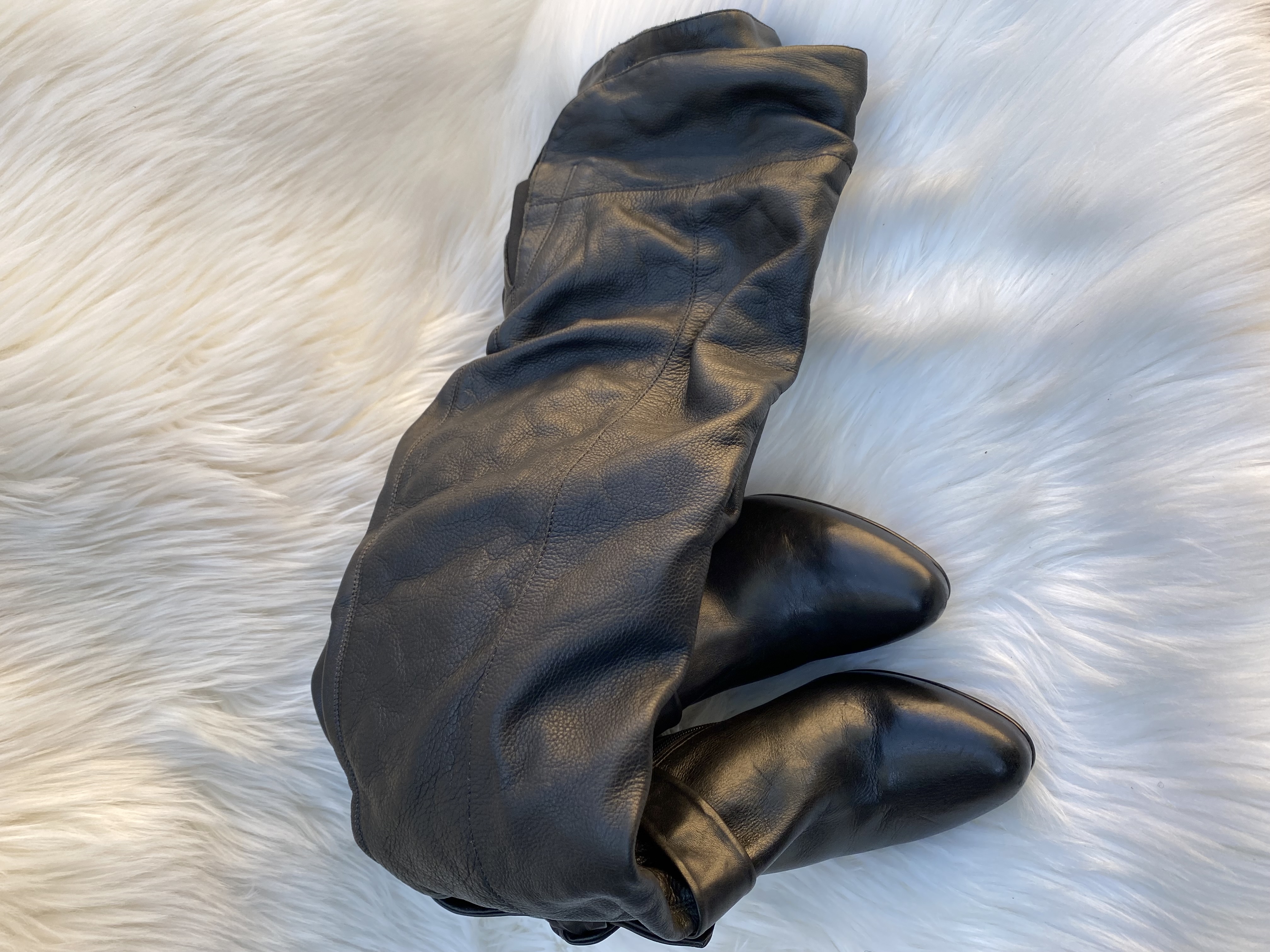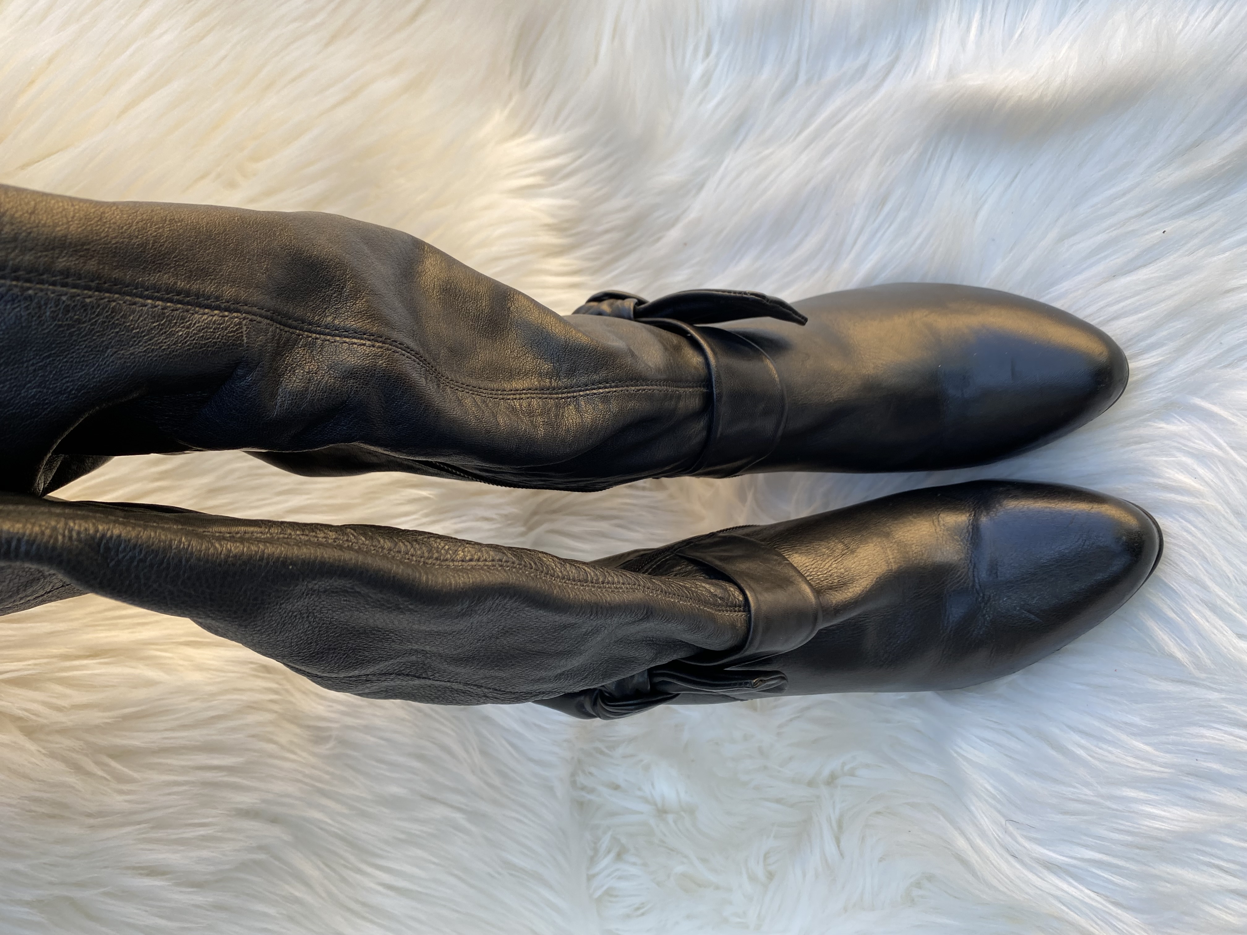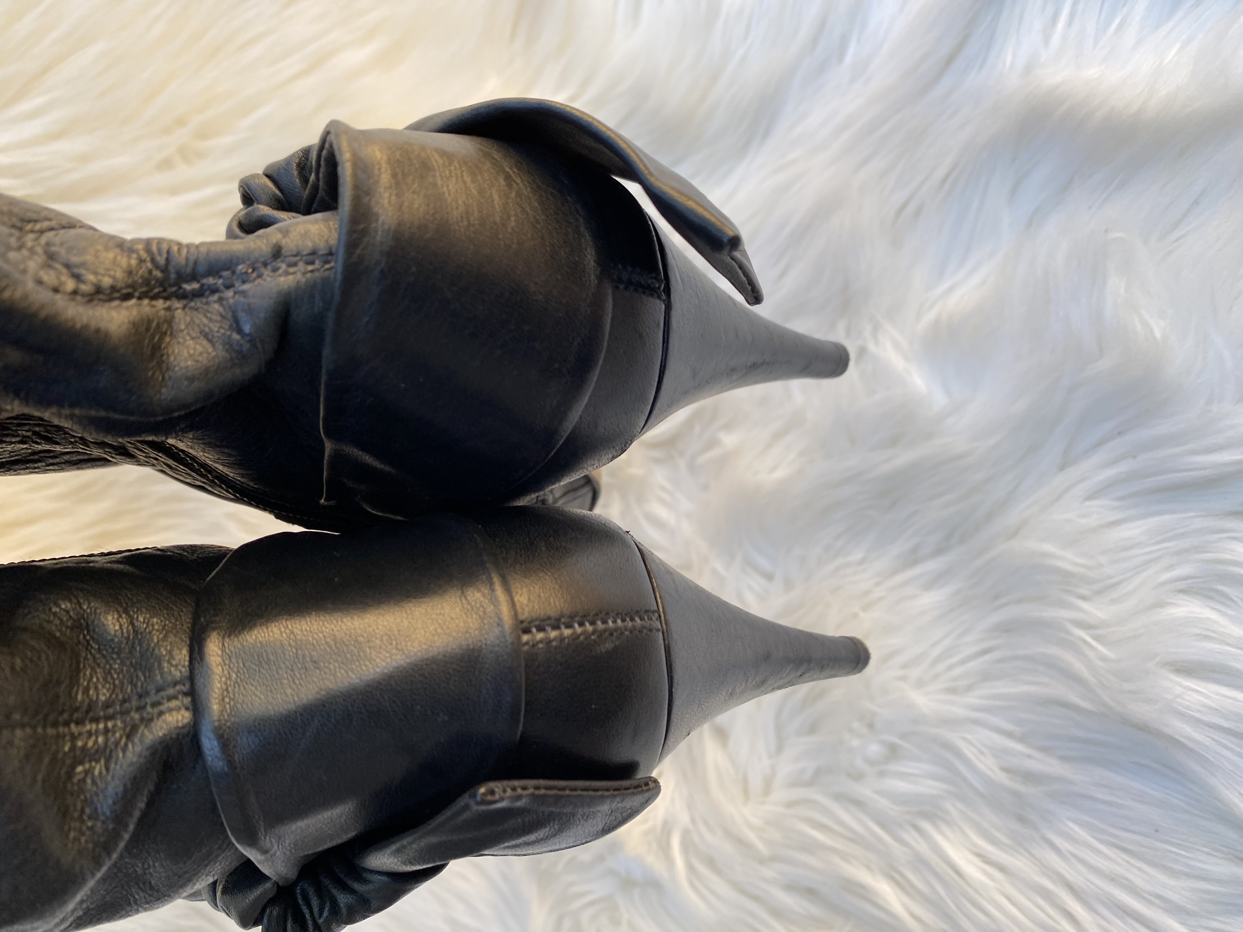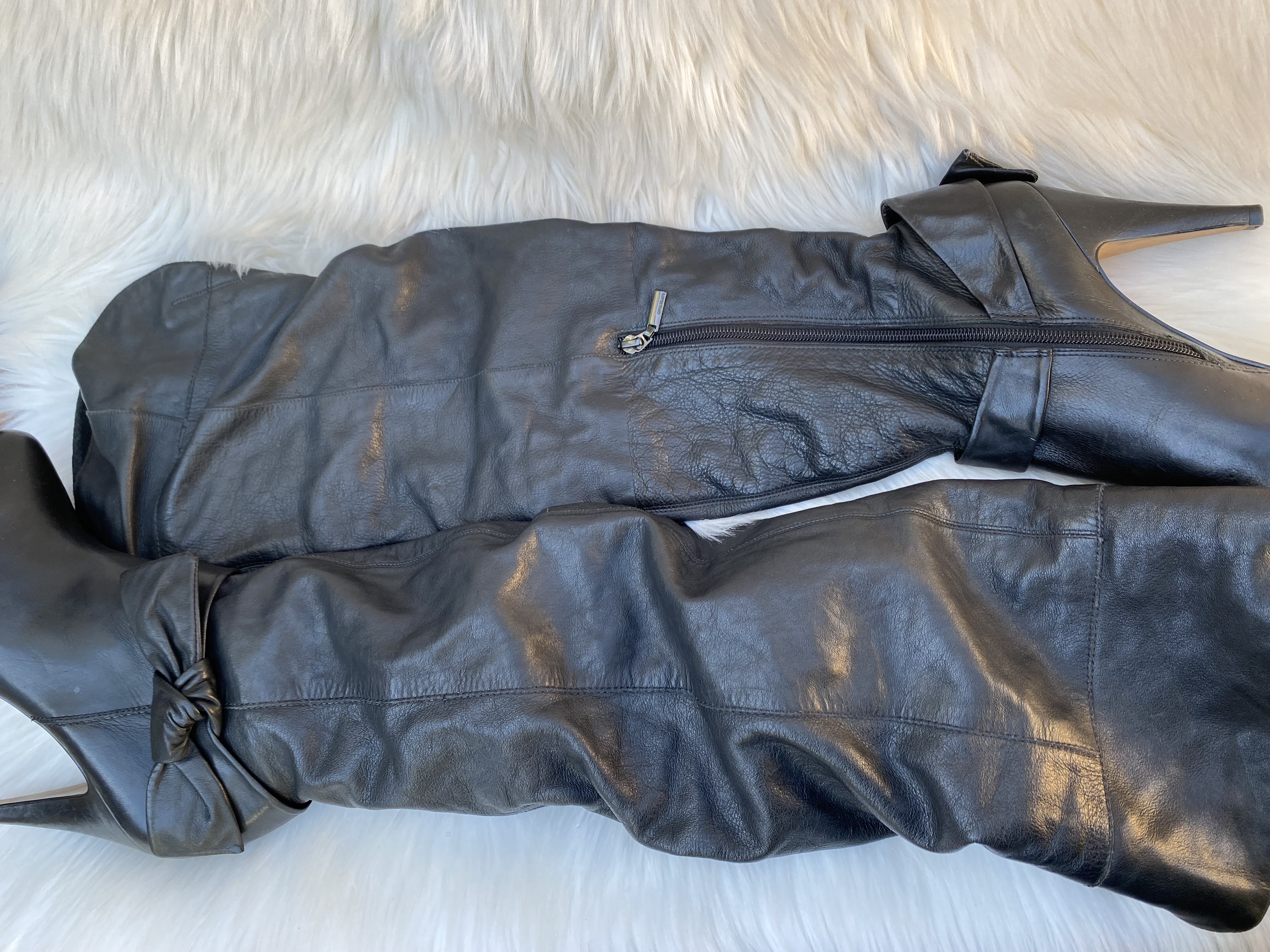 Genuine Leather knee-high bow boo fashion boots.Good condition. Size uk 6. Regular calf fit. Black colour. 4 inches heel height.