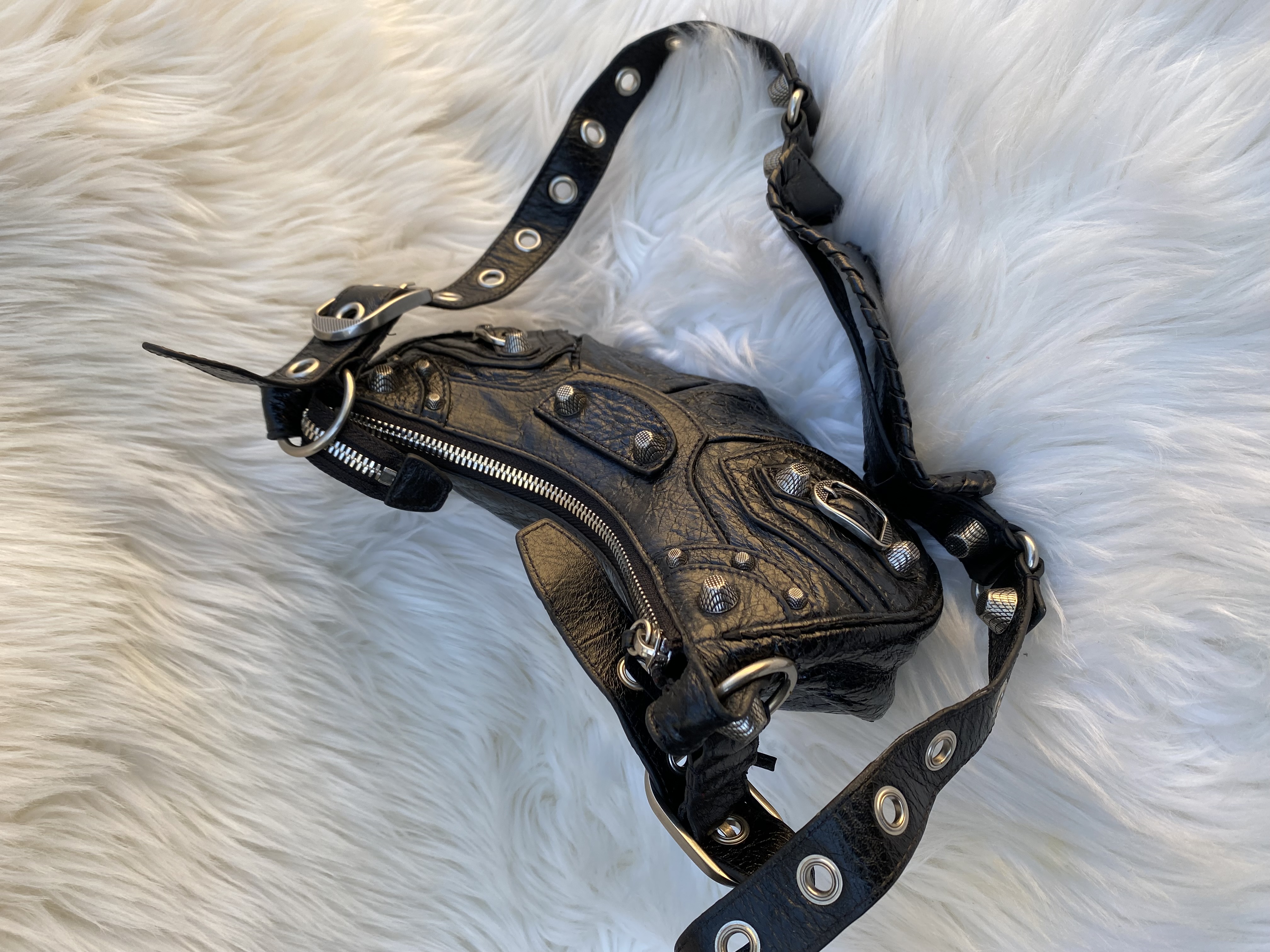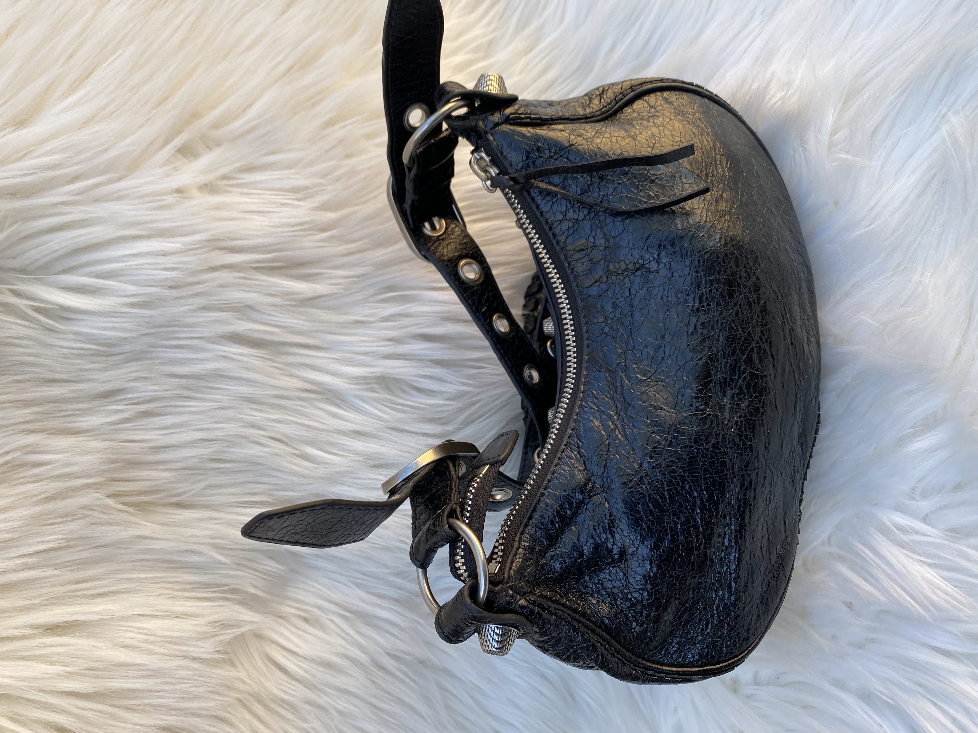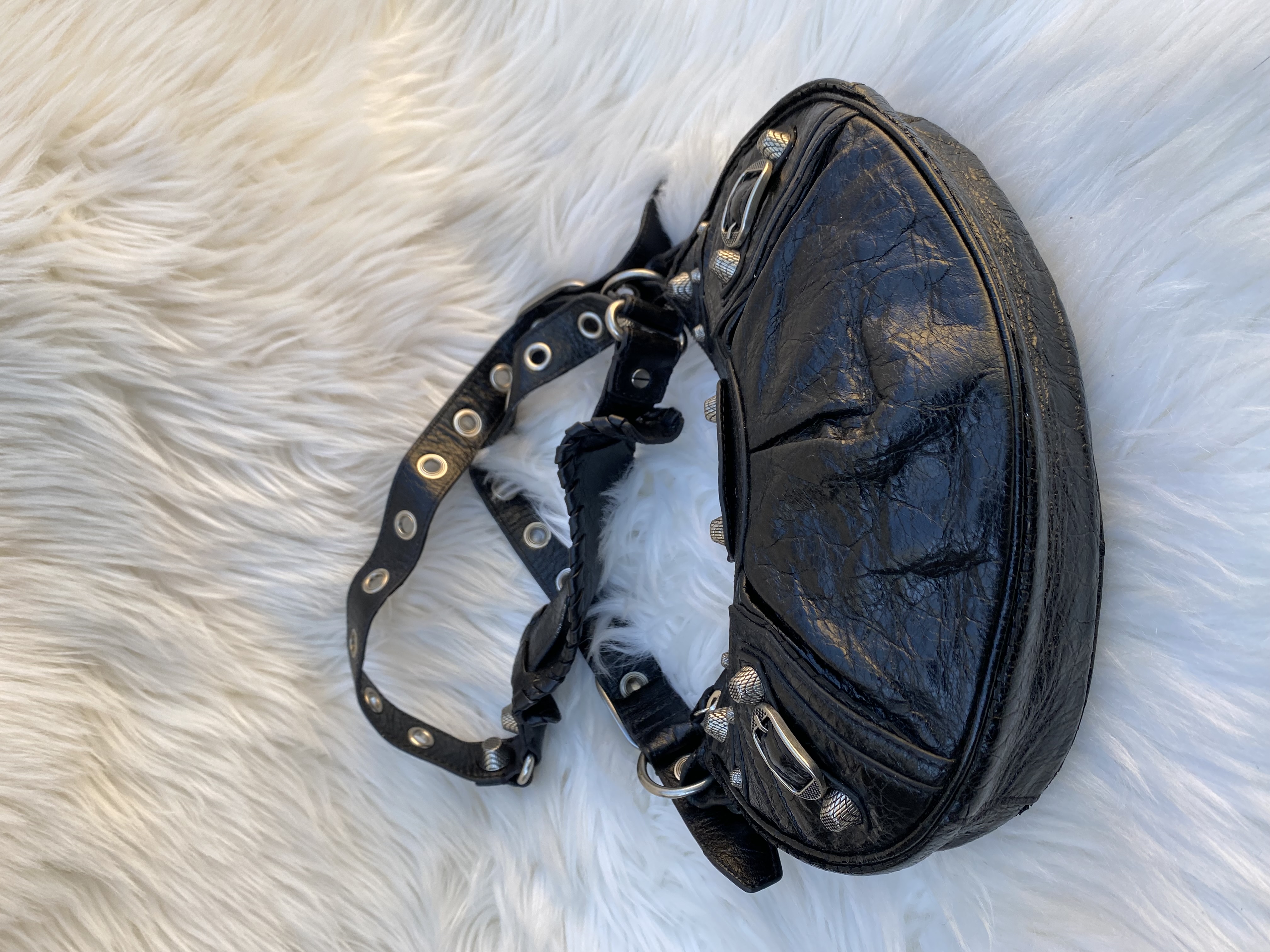 Pre-loved balenciaga Cagole studded crossbody bag in wrinkled patent leather. Small size. Good condition.