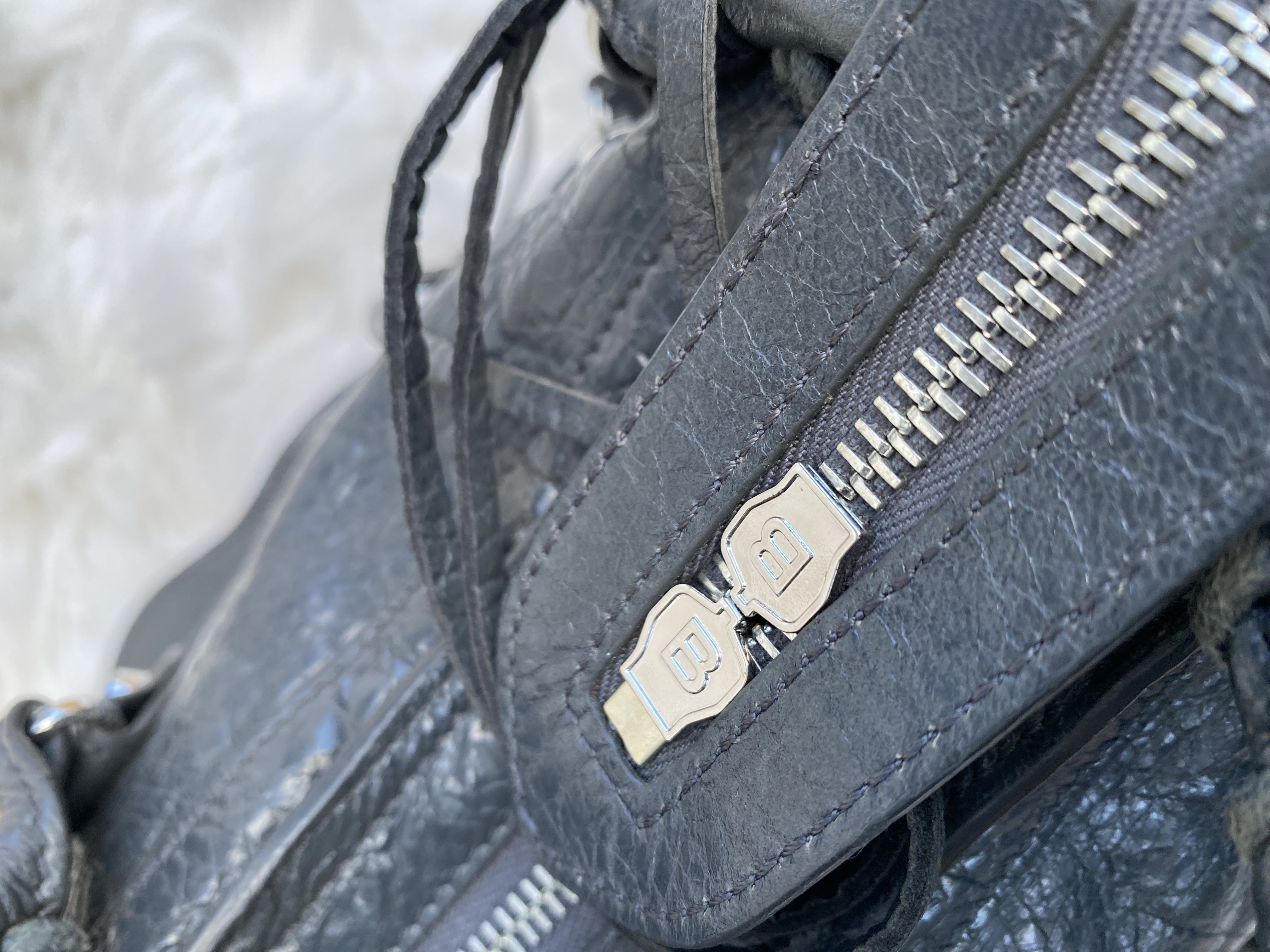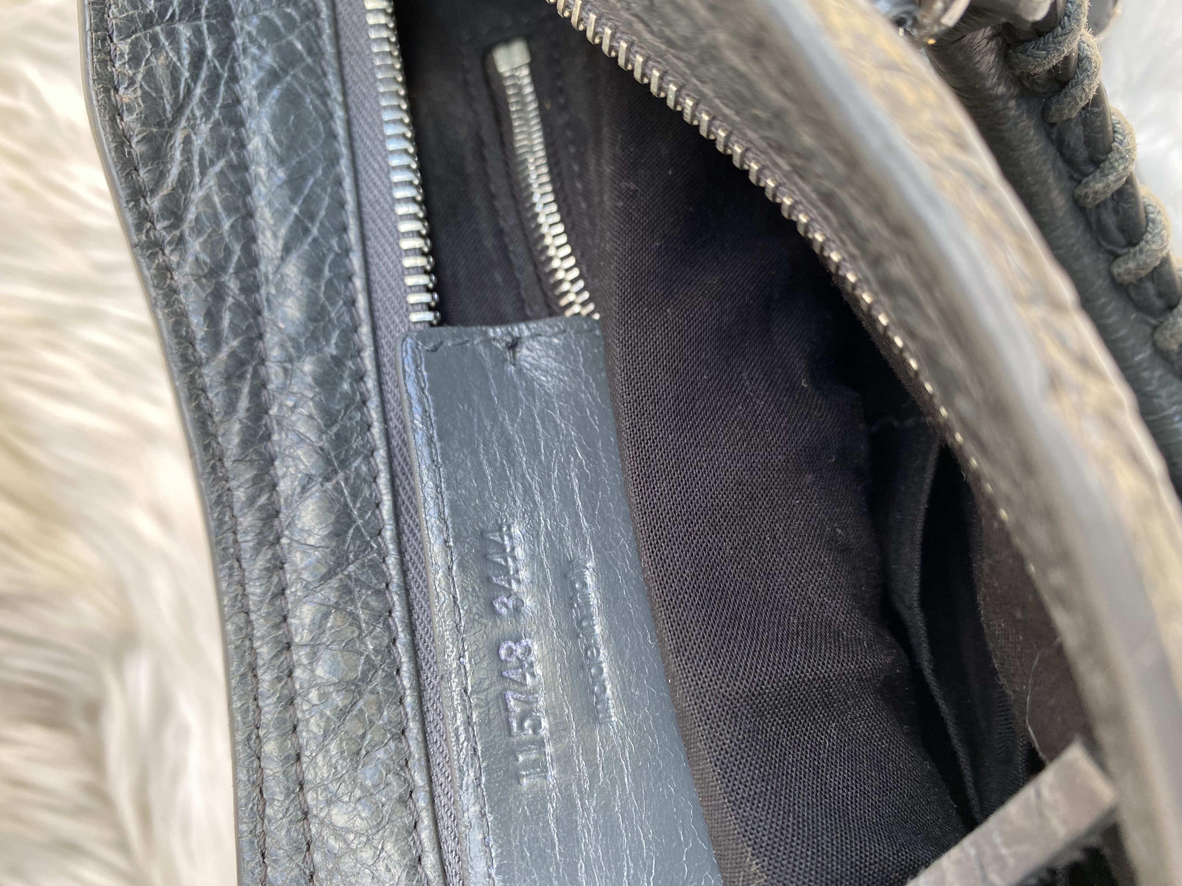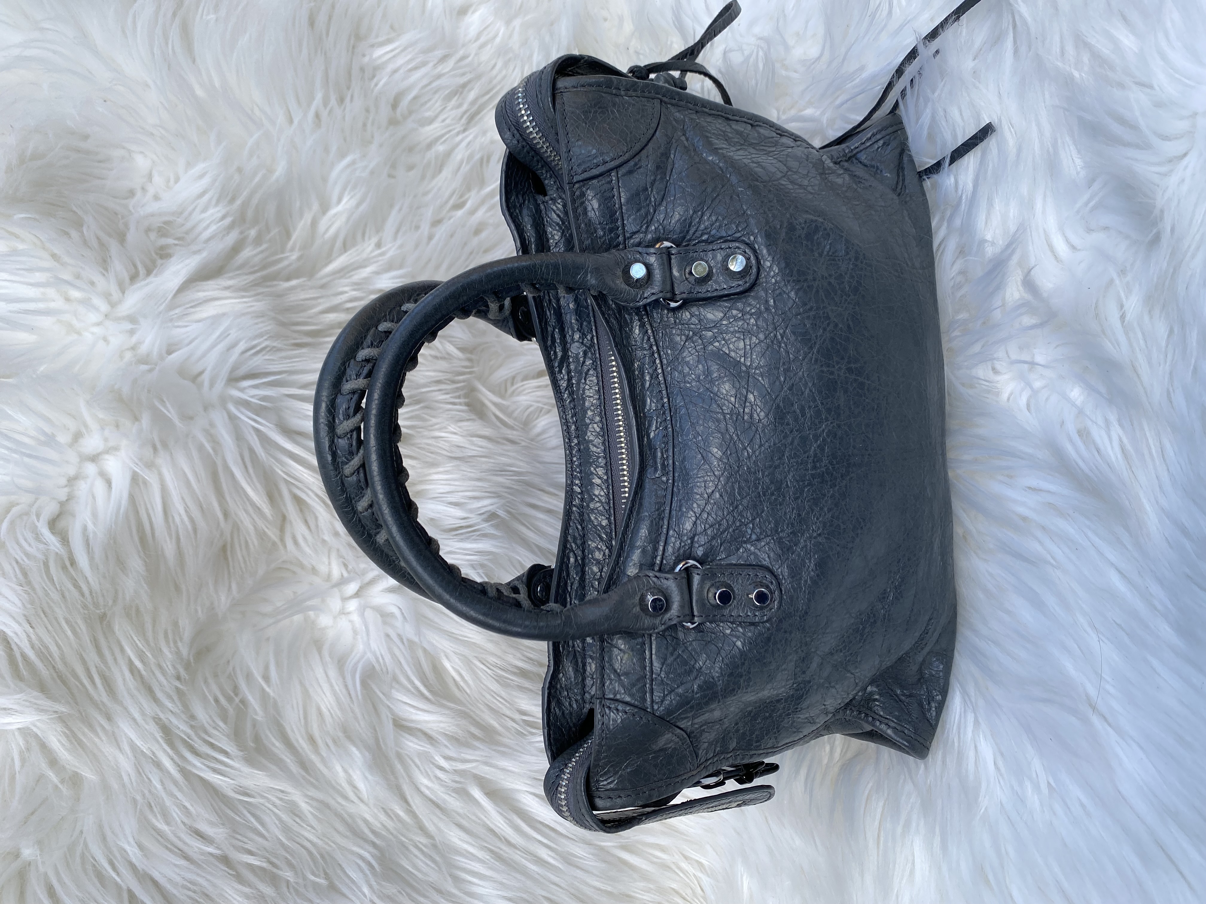 Preloved balenciaga classic leather handbag in grey colour. Small size, good condition.