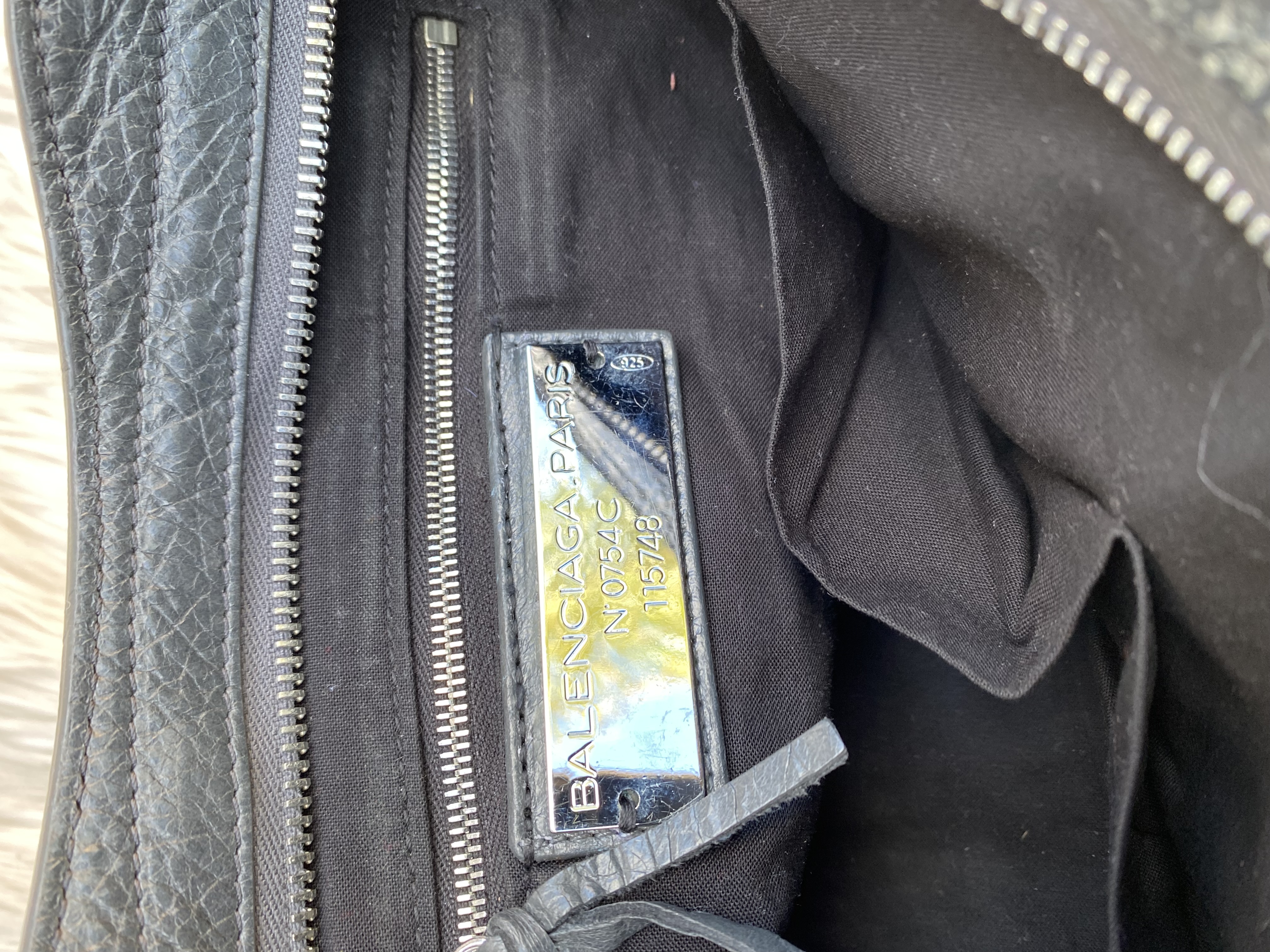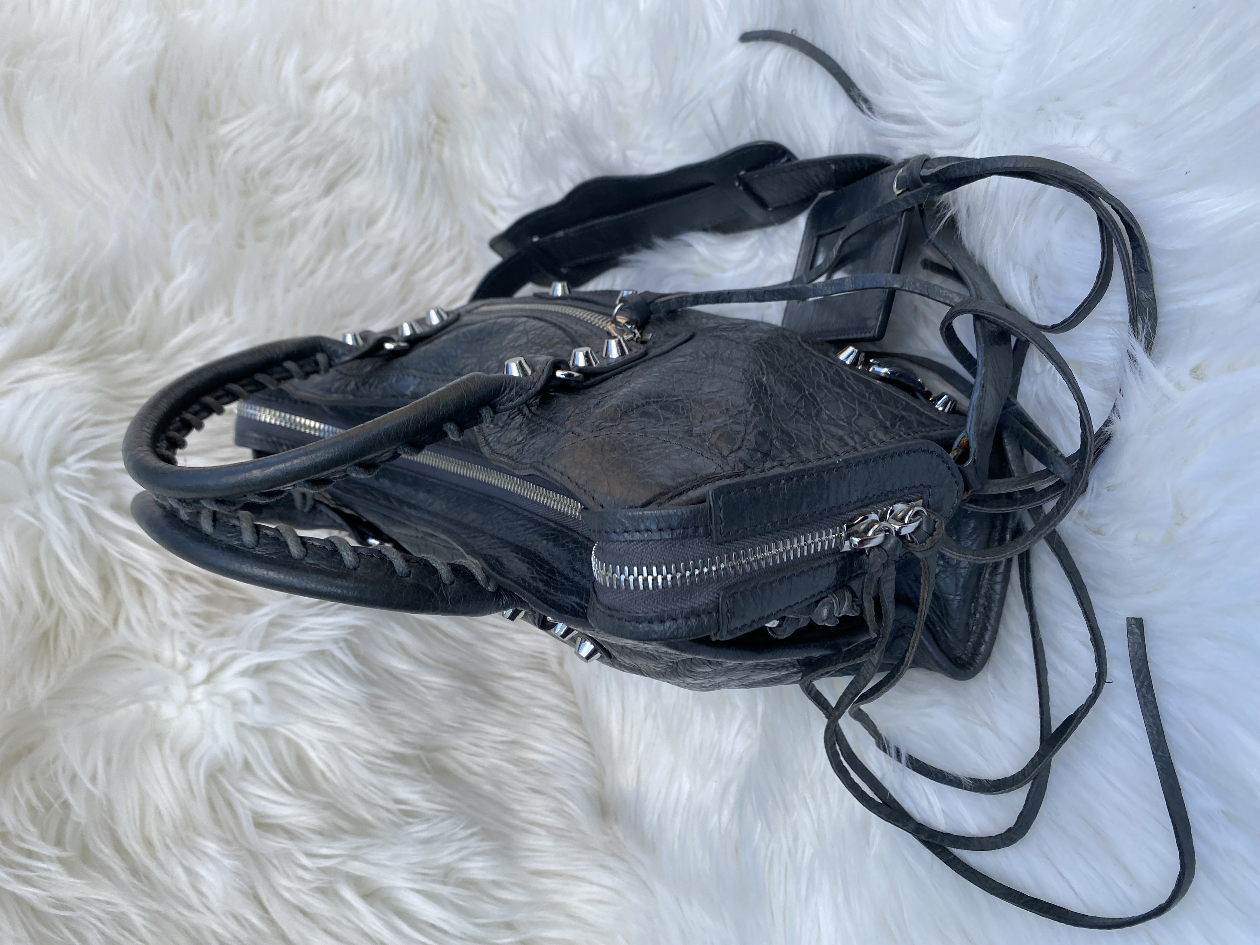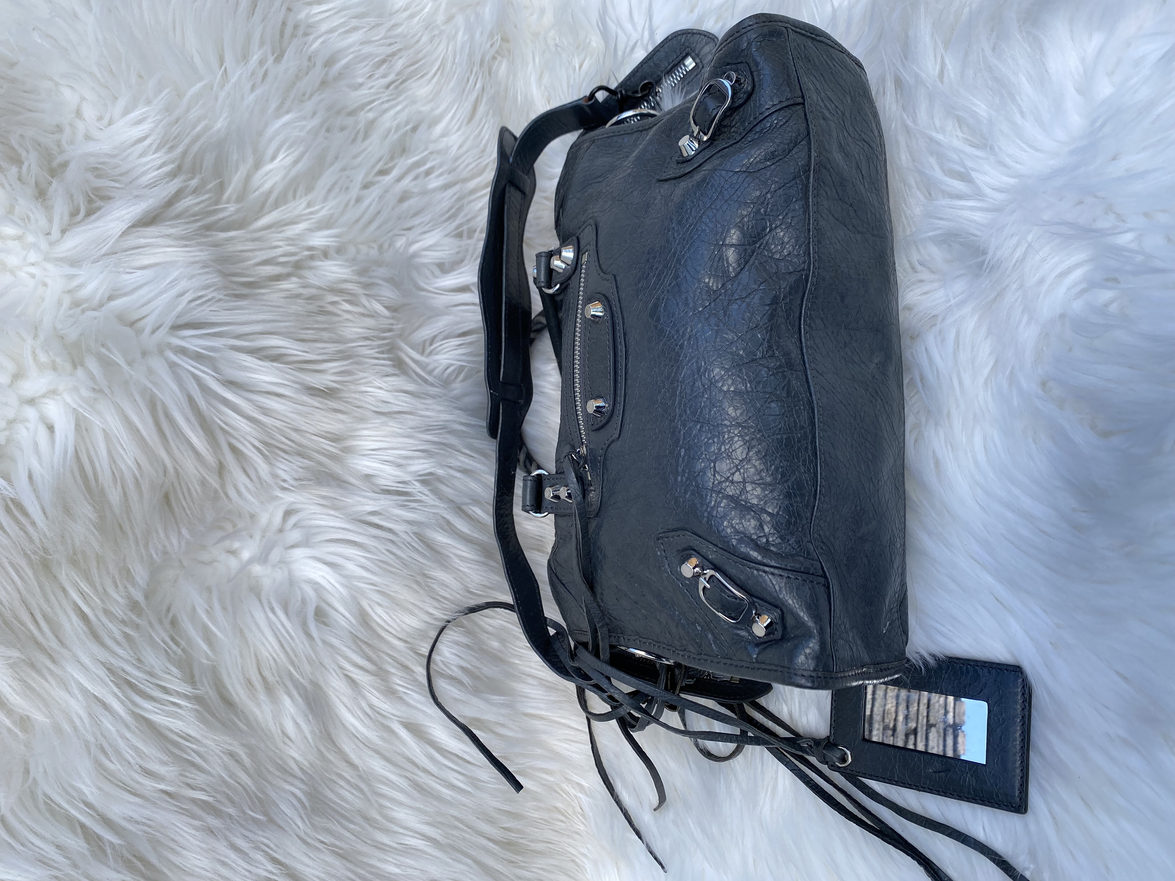 Preloved balenciaga classic leather handbag in grey colour. Small size, good condition.